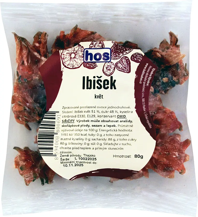 Ibišek květ 51 %, cukr 48 %, kyselina citrónová E330, E129, konzervant OXID SIŘIČITÝ.
