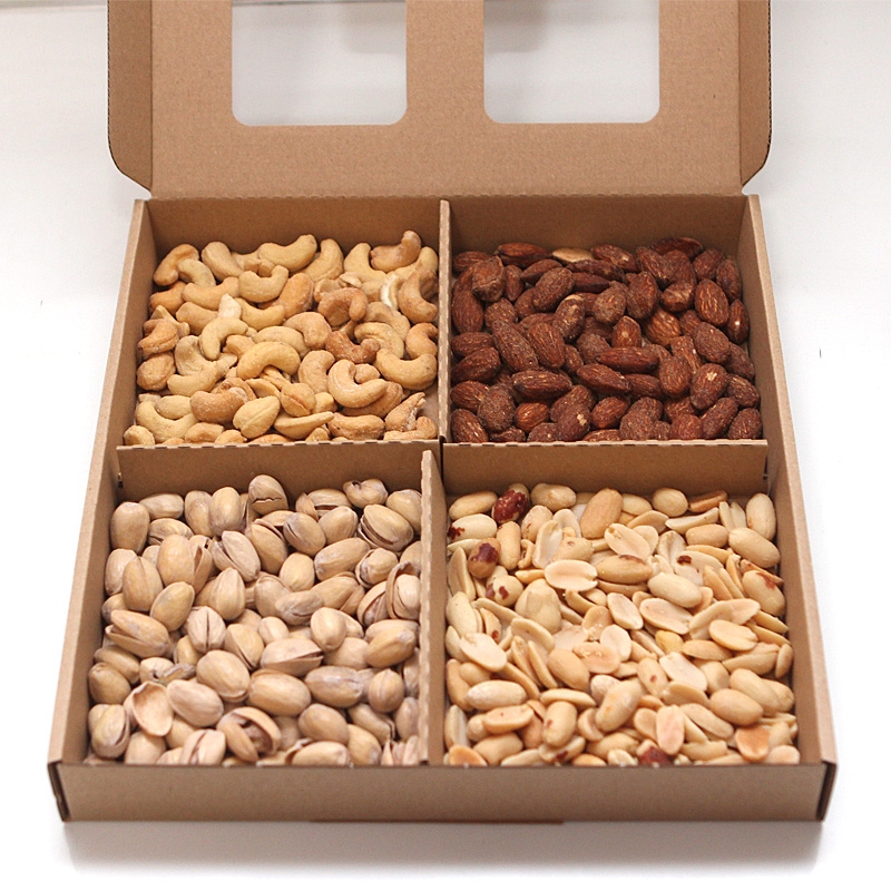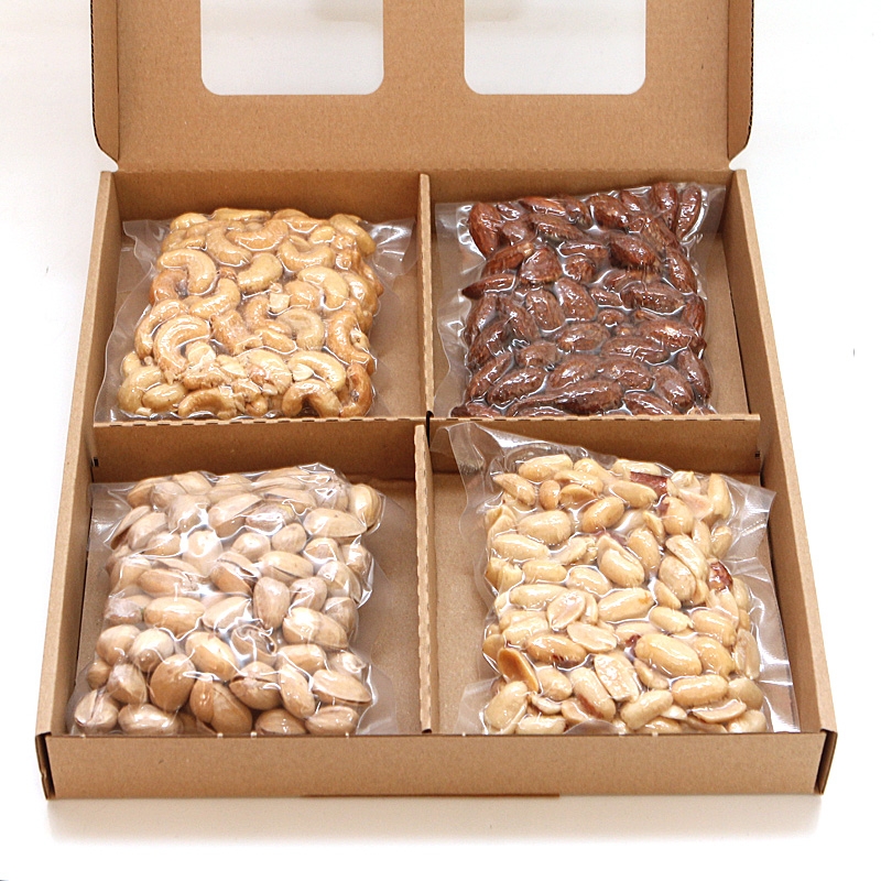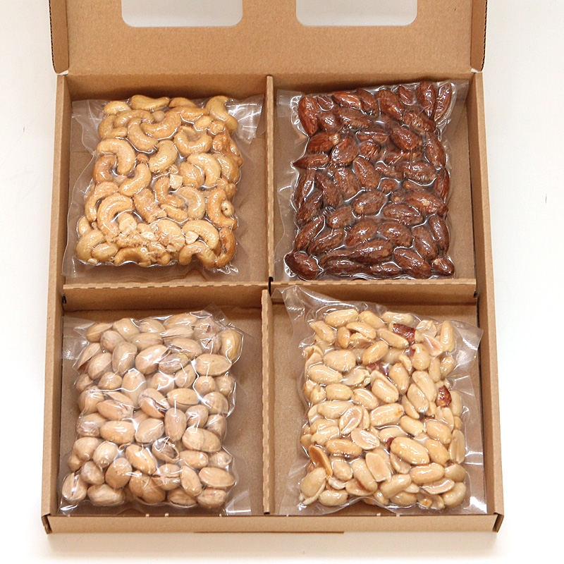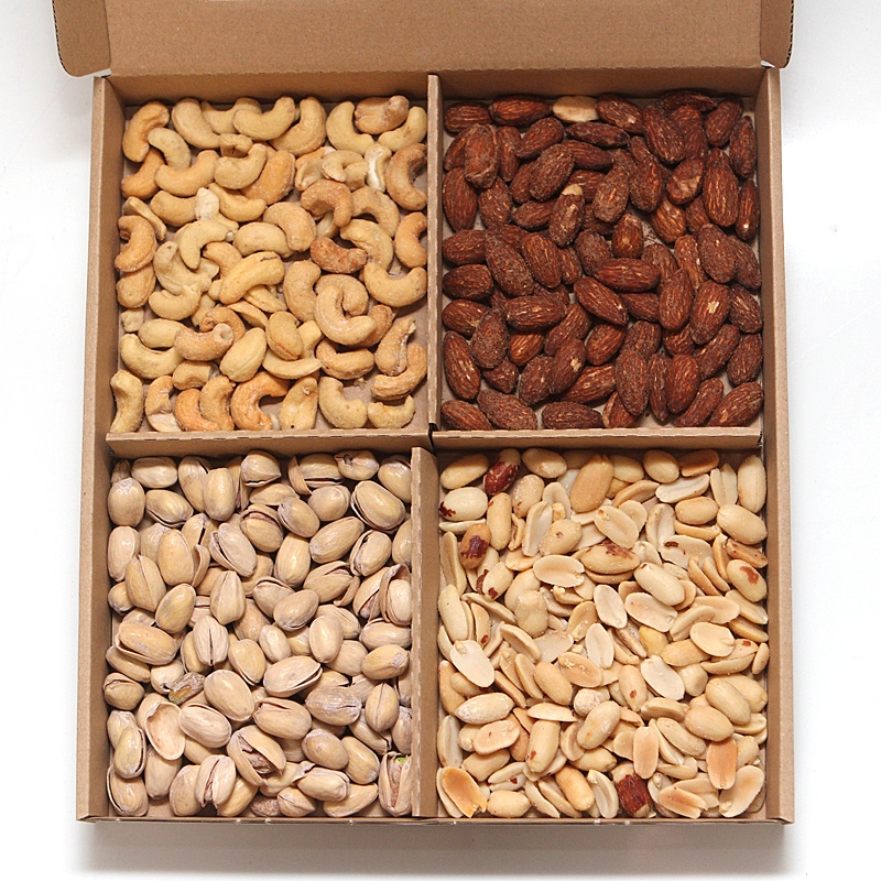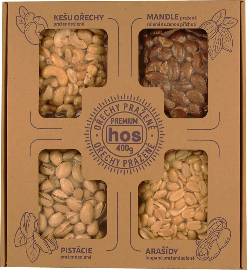 jádra kešu ořechů pražená, solená 25% (jádra kešu ořechů pražená 98%, sůl 1,5%, rostlinný řepkový olej 0,5%); mandle jádra pražená solená s příchutí uzenou 25% (pražená jádra mandlí 96%, směs koření kouřového aromá 1,97% (E621, sůl, maltrodextrin, E504, aroma-obsahuje alergen: sója, mléko,lepek, celer), rostlinný řepkový olej 1,6%,sůl 0,35%); arašídy loupané pražené,solené (arašídy loupané pražené 98%, sůl do 1,5%, rostlinný řepkový olej 0,5%); pistácie pražené solené (pistácie pražené 98%, sůl 2%).