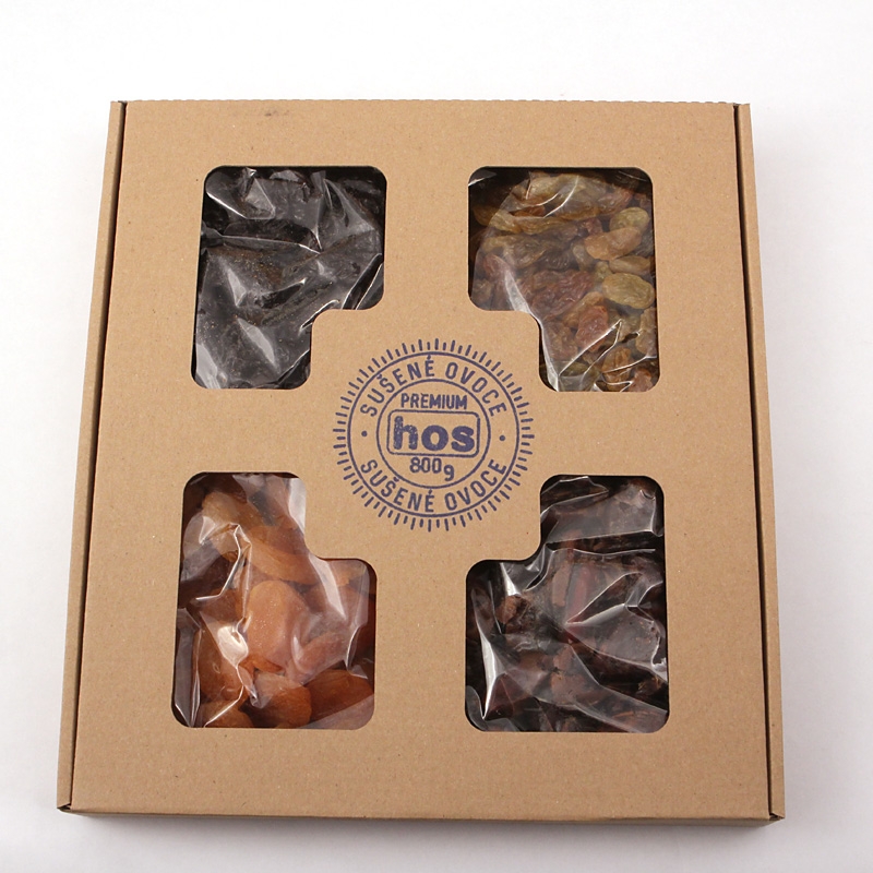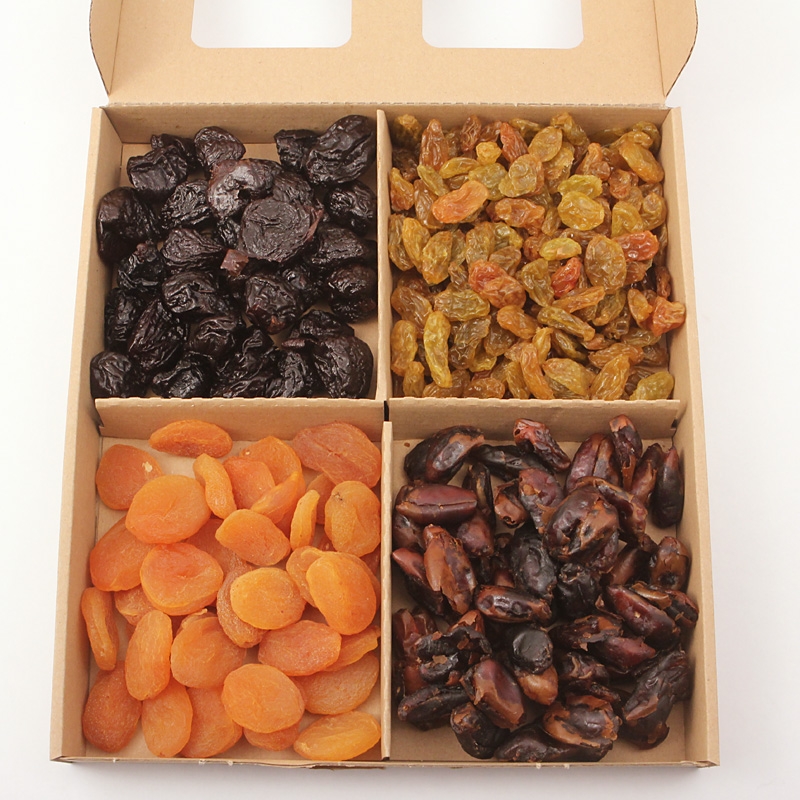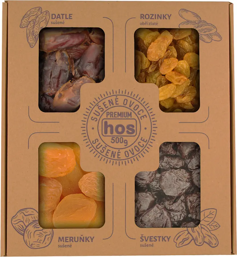 Švestky sušené 25 % (švestky 99 %, slunečnicový olej, konzervant E202); meruňky sušené 25 % (meruňky, konzervant: oxid siřičitý); datle 25 %; rozinky obří zlaté 25 % (rozinky, slunečnicový olej, konzervant: oxid siřičitý)