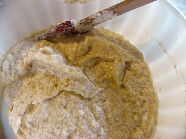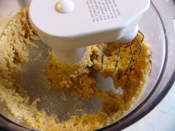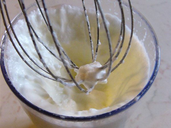 2 Směs důkladně míchejte asi 5 minut metlami nebo v kuchyňském robotu. Pak ušlehejte tuhý sníh z bílků.