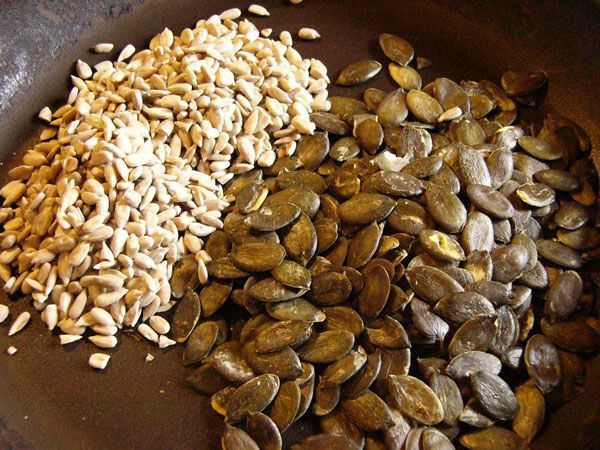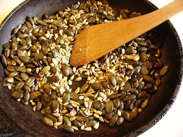 1 Na suché pánvi opražte dýňová a slunečnicová semínka.