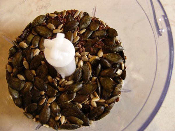 2 Opražená semínka společně s lněným semínkem nasypte do kuchyňského robotu a zpracujte na kaši.