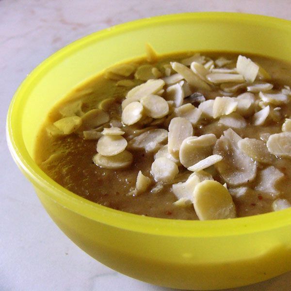 7 Halwu podávejte horkou, ozdobenou mandlovými lupínky.