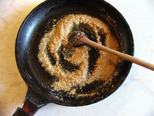 4 Na pánvi se silným dnem rozehřejte přepuštěné máslo a osmahněte mandlový prášek (asi 2 minuty)